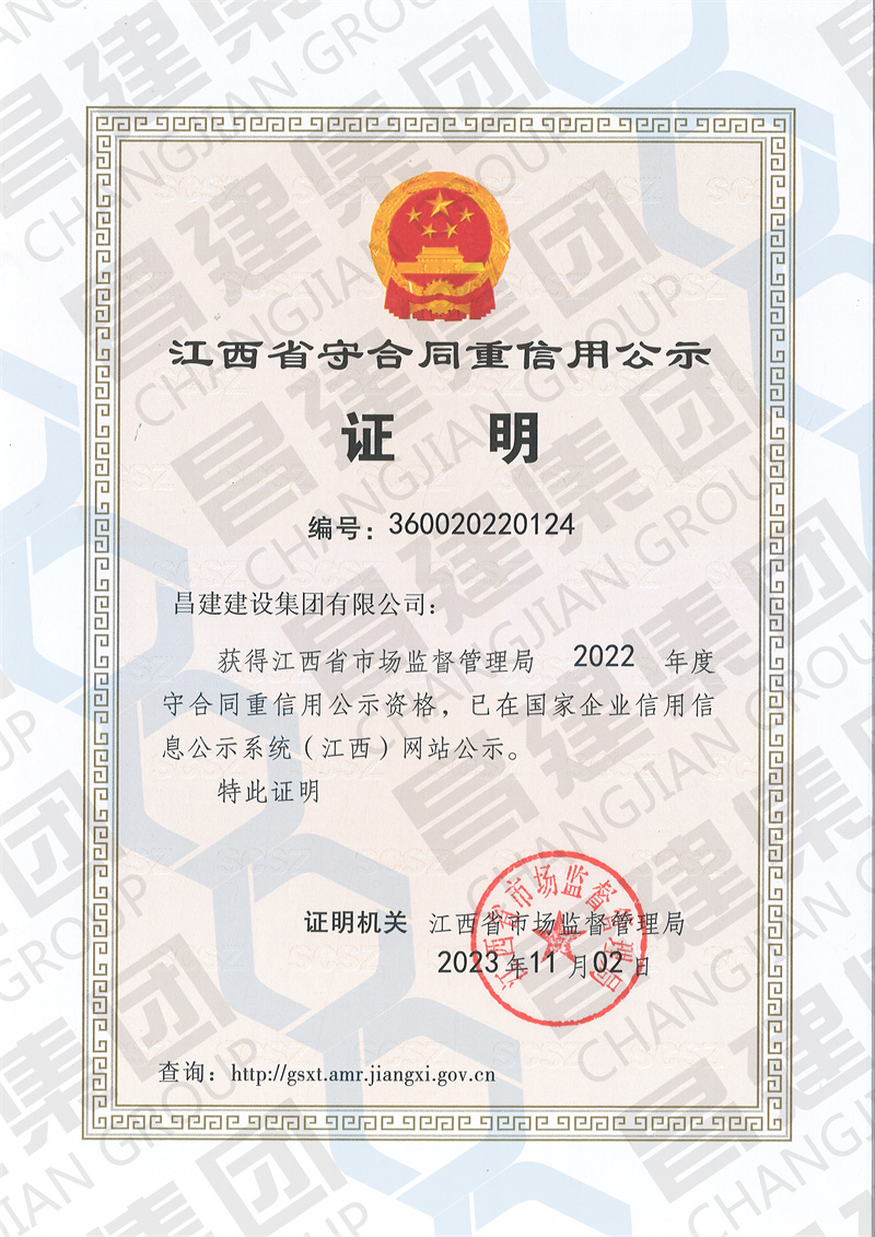 为持续提高江西省市场主体合同管理水平,有效助力社会信用体系建设,营造知信、守信、用信、增信的市场氛围,近日,江西省市场监督管理局公布了“2022年度江西省守合同重信用公示单位”的获奖名单,昌建集团位列其中!我司已连续多年荣膺该项荣誉!